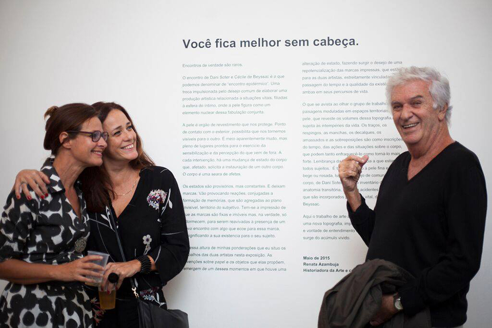Encontros de verdade são raros. O encontro de Dani Soter e Marie-Cécile Conilh de Beyssac é o que podemos denominar de “encontro epidérmico”. Uma troca impulsionada pelo desejo comum de elaborar uma produção artística relacionada à situações vitais, filiadas à esfera do íntimo, onde a pele figura como um elemento nuclear dessa fabulação conjunta. A pele é orgão de revestimento que nos protege. Ponto de contato com o exterior, possibilita que nos tornemos visíveis para o outro. É meio aparentemente mudo, mas pleno de lugares prontos para o exercício da sensibilização e da percepção do que vem de fora. A cada intervenção, há uma mudança de estado do corpo que, afetado, solicita a instauração de um outro corpo. O corpo é uma seara de afetos. Os estados são provisórios, mas constantes. E deixam marcas. Vão provocando reações, conjugadas à formação de memórias, que são agregadas ao plano invisível, território do subjetivo. Tem-se a impressão de que as marcas são fixas e imóveis mas, na verdade, só adormecem, para serem reavivadas à presença de um novo encontro com algo que ecoe para essa marca, resignificando a sua existência para o seu sujeito. É nessa altura de minhas ponderações que eu situo os trabalhos das duas artistas nesta exposição. As invenções sobre papel e os objetos que elas propõem, emergem de um desses momentos em que houve uma alteração de estado, fazendo surgir o desejo de uma repotencialização das marcas impressas, que estão, para as duas artistas, estreitamente vinculadas à passagem do tempo e à qualidade da existência de ambas em seus percursos de vida. O que se avista ao olhar o grupo de trabalhos são paisagens moduladas em espaços territoriais, onde a pele, que reveste os volumes dessa topografia, está sujeita às intempéries da vida. Os traços, os respingos, as manchas, os decalques, os amassados e as sobreposições são como inscrições do tempo, das ações e das situações sobre o corpo, que podem tanto enfraquecê-lo como torná-lo mais forte. Lembrança da impermanência a que estamos todos sujeitos. É tanto a alusão à pele fina e frágil, bege ou rosada, lugar do desejo de comunicar com corpo, de Dani Soter, como o inventário de uma anatomia transitória, sujeita a acidentes e desgastes que são incorporados pelo fluxo vital, de Marie-Cécile Conilh de Beyssac. Aqui o trabalho de arte aponta para a afirmação de uma nova topografia, impulsionada pela inquietação e vontade de entendimento do novo estado que surge do acúmulo vivido. Renata Azambuja Curadora |